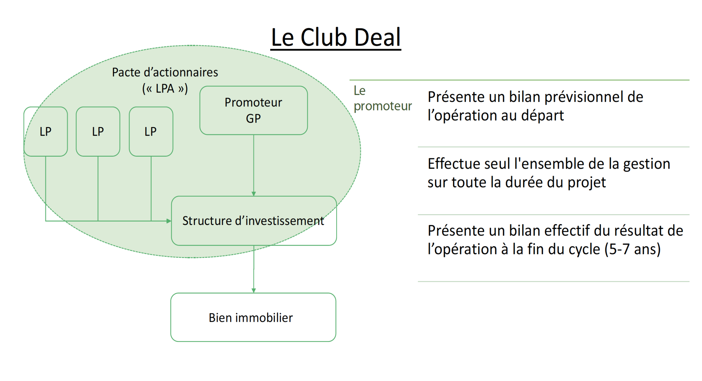«Lorsqu’on lit la presse, on remarque que depuis plusieurs années, le Club Deal Immobilier semble avoir le vent en poupe», relate Sylvie. Parfois comparé au crowdfunding immobilier, le Club Deal immobilier naît de l’initiative d’un promoteur immobilier bénéficiant d’un bon track record, qui regroupe autour de lui un nombre d’investisseurs privés, généralement de deux à quelques dizaines, afin d’acquérir collectivement un ou plusieurs biens immobiliers. Les biens cibles sont identifiés à l’origine, ce qui permet, en théorie, de mieux définir le rendement potentiel et les risques associés. Au sein du pacte d’actionnaires représenté par le Club Deal, ce promoteur se positionne en tant que «General Partner» (GP). C’est lui qui, contractuellement, se voit confier l’entièreté de l’exécution du ou des projets du Club Deal, les transactions d’investissement, la mise en valeur des biens, leur administration et leur revente finale. Les autres investisseurs, appelés «Limited Partners» (LP), n’ont d’autre rôle que d’apporter les financements au début, et de recevoir les fruits de la réalisation du projet à la fin. En cours de projet, ils peuvent recevoir un reporting périodique, dont la qualité varie selon les conditions contractuelles pré-établies. Le schéma de fonctionnement est repris ci-après.