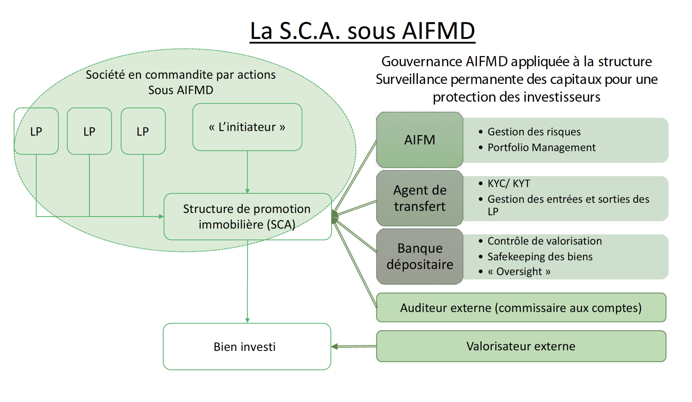 Au travers de la gouvernance appliquée à cette structure sous AIFMD, l’ensemble des décisions de gestion de l’initiateur sont contrôlées avant d’être validées par l’AIFM (la société de gestion). Celle-ci siège d’ailleurs au comité d’investissements. De la même façon, toute la problématique de contrôle des entrées et sorties de capitaux, les revues KYC («know your customer») / KYT («know your transaction») sont effectués par l’Agent de Transfert, un organisme professionnel dédié et également soumis à la surveillance prudentielle. Enfin, la banque dépositaire assure la garde et la sécurisation des actifs. Son activité de contrôle de valorisation des biens, qui s’appuie sur le valorisateur externe, une référence professionnelle incontestée sur le marché, garantit leur valorisation réelle et juste. Elle opère enfin une supervision permanente de l’ensemble de la gestion.