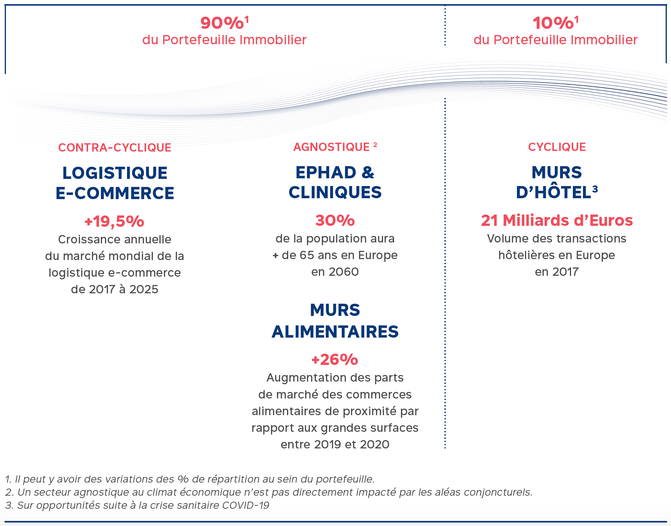 Le Fonds accompagnera* des enseignes AAA dans leur développement Européen et deviendra propriétaire de leurs murs. La structuration de portefeuille s’articule autour de trois marchés principaux, la logistique en e-commerce, les maisons de retraite (EHPAD) & cliniques et les surfaces alimentaires, auxquels s’ajoutent et les murs d’hôtels de façon opportuniste.